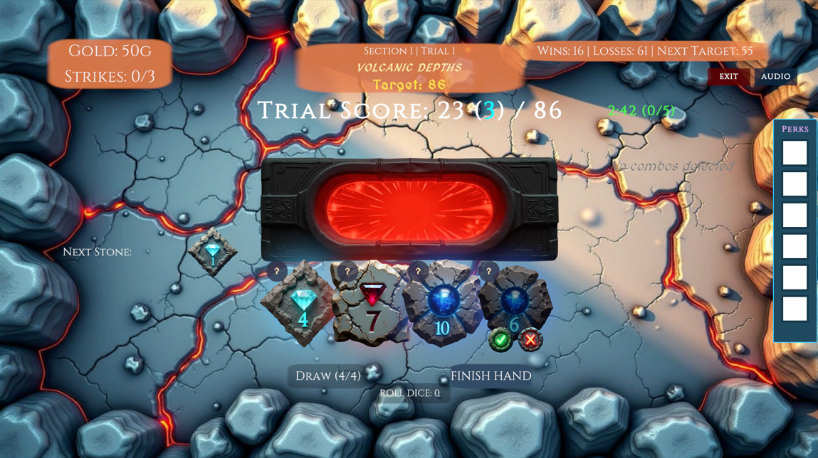 Three strikes ends your run. 4 draws per standard trial with max 7 in hand (excluding Perk Rewards). Make every draw count. Don't just drop your stones in the bowl and hope for the best!